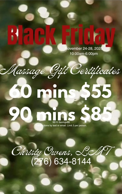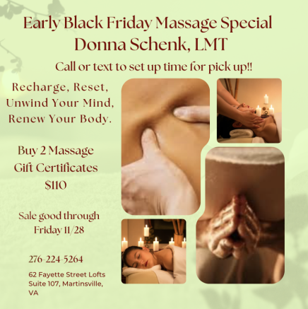 We are a Yoga and Massage studio located in beautiful Martinsville, Virginia. Our studio is locate in the Fayette Street Lofts, 62 Fayette Street, Martinsville, VA Suites 107 (Massage) and 109 (Yoga Studio). We offer a variety of holistic healing modalities to nurture and rejuvenate your body, mind, and spirit. It's our goal to help improve your physical wellness and enhance your emotional wellbeing to create a healthier, happier you.